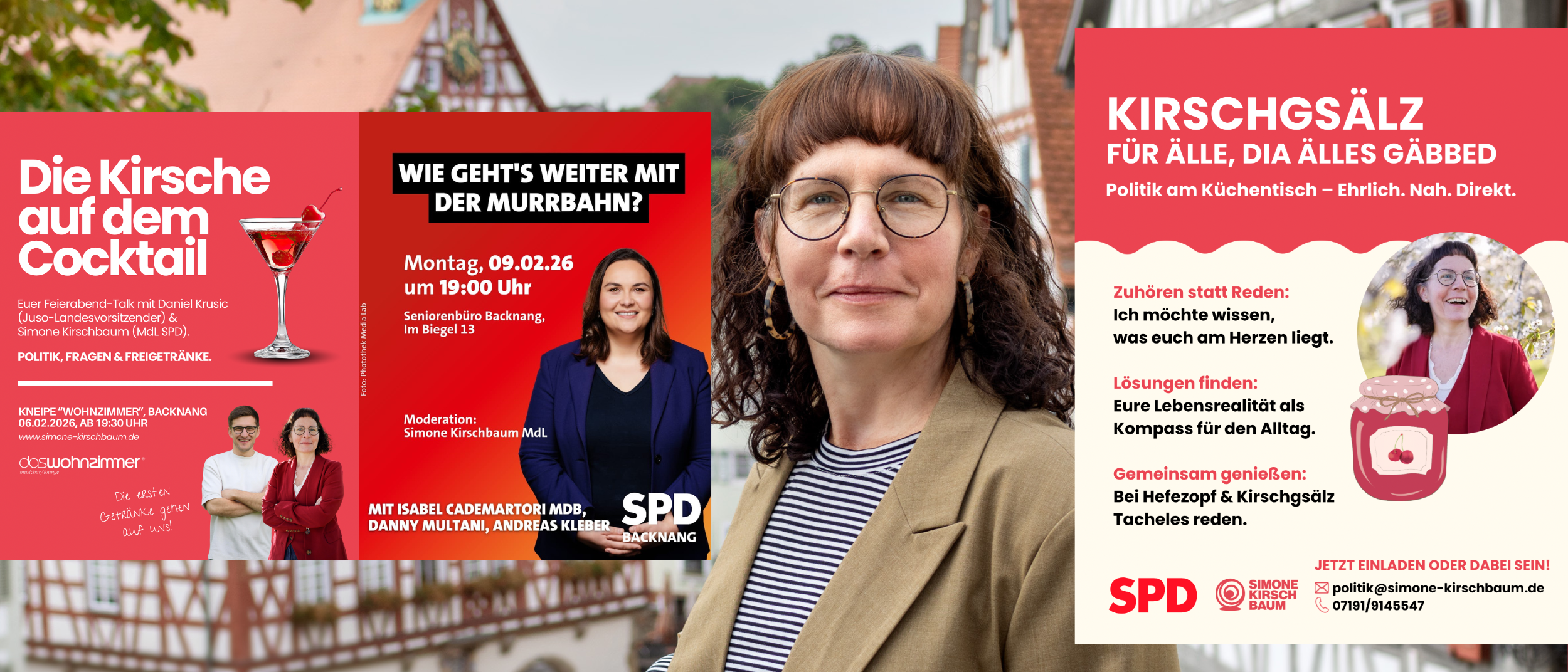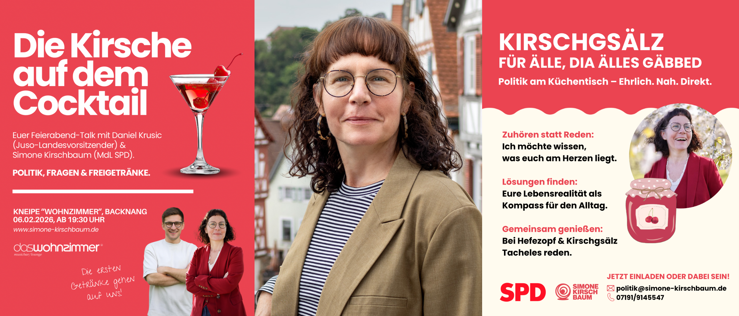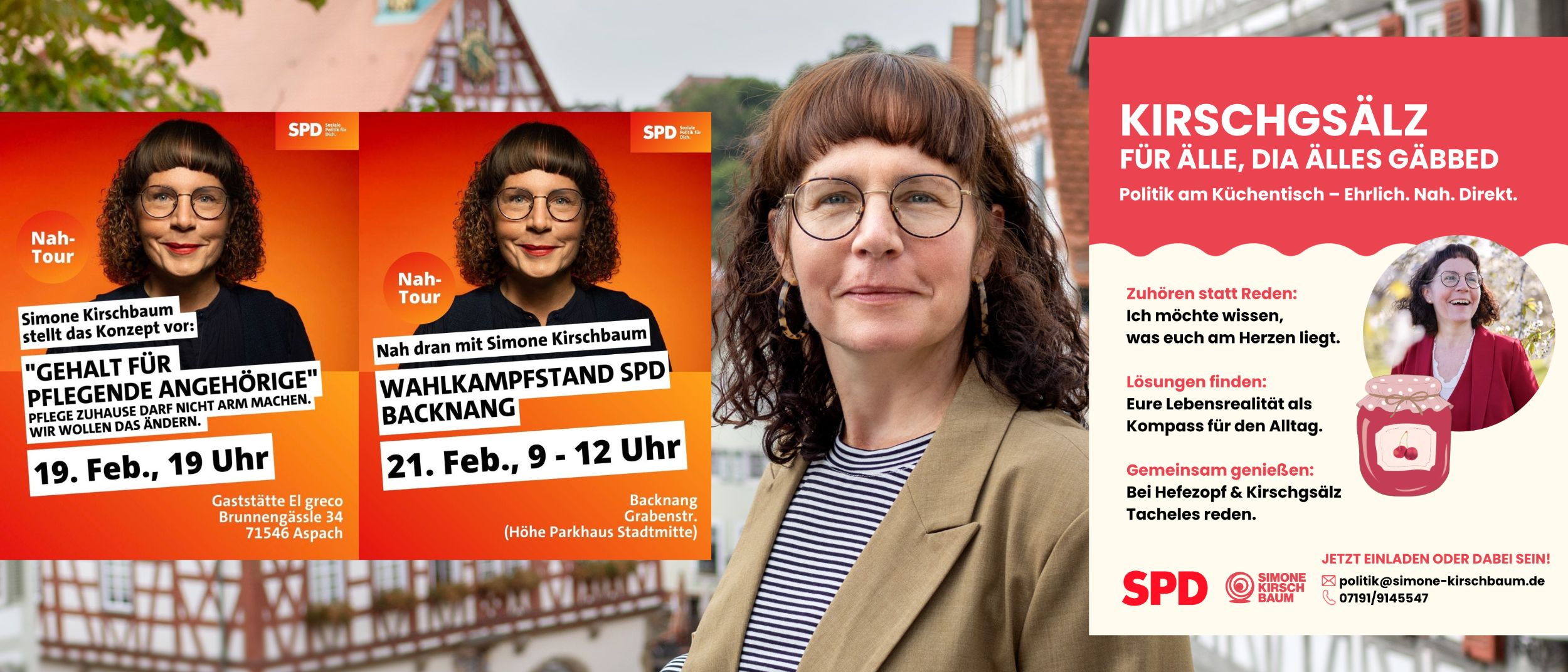 Ich bin Simone Kirschbaum, 50 Jahre, Hebamme, Trauerbegleiterin, verheiratet mit meinem Mann Thomas, Mutter von zwei Söhnen, Sozialdemokratin.